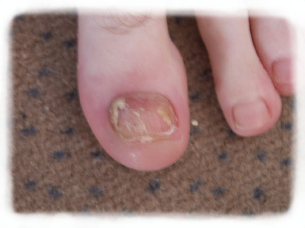 Das Bild zeigt eine Nagelmykose, dieser Pilz bedurfte dringender Behandlung. Bitte beachten Sie auch das Ergebnis nach 6 Monaten regelmässiger med. Fußpflege